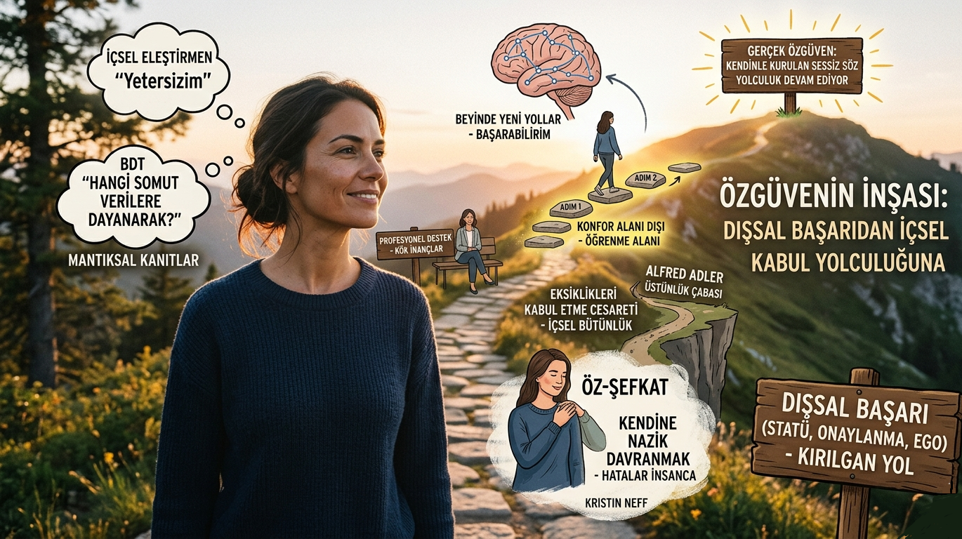 Bilişsel Davranışçı Terapi (BDT) perspektifinden bakıldığında, özgüvensizlik genellikle “Ben yetersizim” gibi kök inançlardan beslenir. İçsel eleştirmen, kanıta dayalı olmayan genellemeler yapar. Özgüveni geliştirmek, bu otomatik düşünceleri fark edip onları mantıklı kanıtlarla sorgulamayı gerektirir. “Herkes benden daha iyi” düşüncesine karşı “Hangi somut verilere dayanarak bunu söylüyorum?” sorusunu sormak, zihinsel bir mesafe yaratır ve duygusal tepkinin şiddetini azaltır.